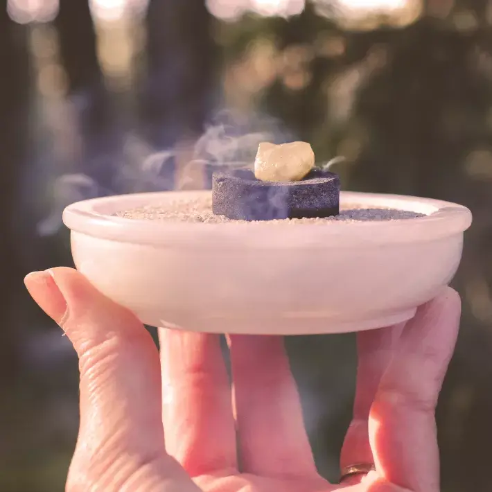 Sie beginnt rasch zu knistern. Danach lege die knisternde Kohle auf Räuchersand oder eine Keramikschale, Metallsieb oder Teller auf Ihr Räuchergefäß. Niemals auf Glas, dieses würde aufgrund der Hitze zerspringen!